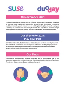 DuoDay brings together disabled people, supported employment agencies and employers to promote equal employment opportunities across Europe. It promotes the positive contribution disabled people make at work by matching disabled jobseekers with employers – enabling the people to learn about their job role. We then hope that the jobseeker will get ongoing support to move onto training, education, paid work or supported employment. On 18 November 2021, SUSE hosted our 3rd DuoDay and our theme was Play Your Part. We worked with our members and colleagues to address the Disability Employment Gap by developing relationships with employers and highlighting the contribution disabled people make to Scotland’s businesses and economy. This year we were absolutely thrilled to have been able to bring together over 20 job shadowing opportunities working with a range of employers including Morrisons, Farmfoods, Premier Inn, Citizens Advice Bureau and Maxim Scotland. 18 November 2021 Our theme for 2021: Play Your Part Our Duos